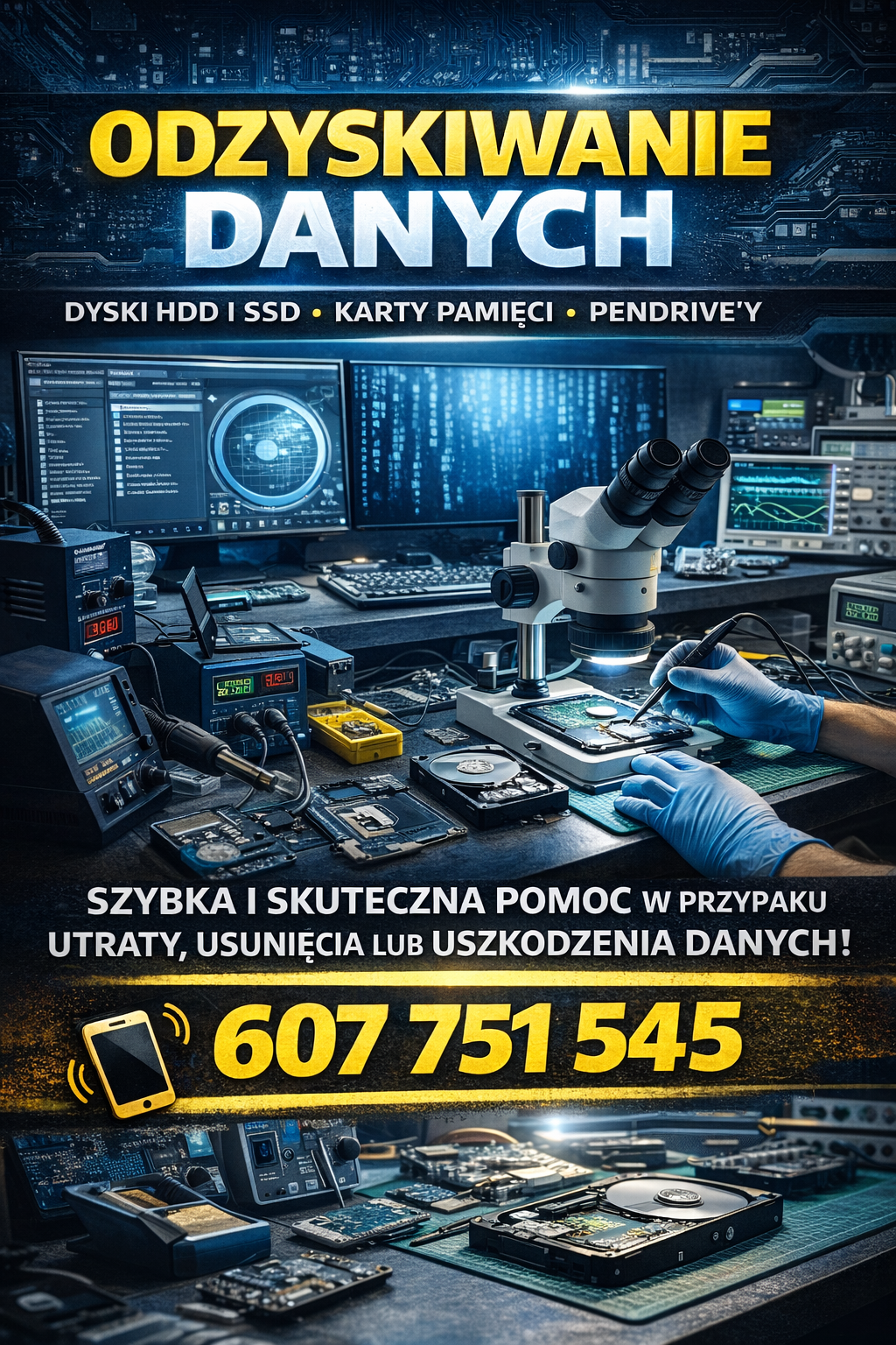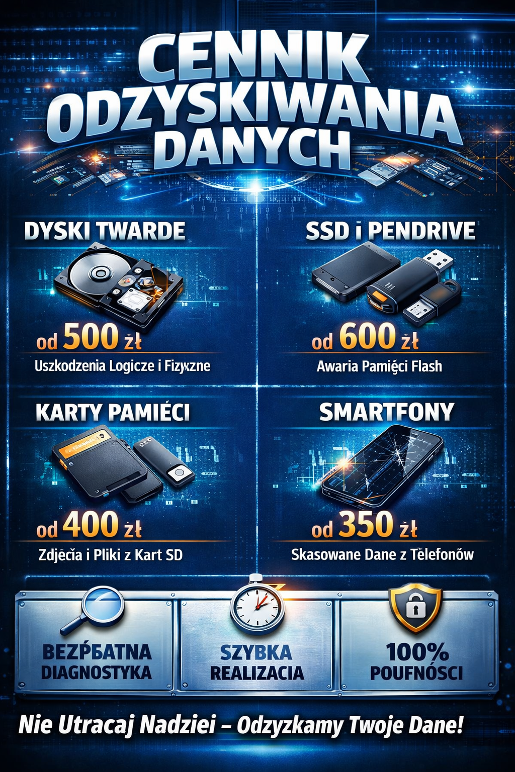 Oferujemy profesjonalne odzyskiwanie danych w Krakowie z dysków HDD i SSD, kart pamięci oraz telefonów komórkowych. Pomagamy w przypadku przypadkowego usunięcia plików, uszkodzeń mechanicznych, zalania, awarii systemu czy formatowania nośnika. Dysponujemy specjalistycznym sprzętem i doświadczeniem, dzięki czemu skutecznie odzyskujemy zdjęcia, dokumenty, filmy oraz inne ważne dane. Zapewniamy pełną poufność oraz bezpieczeństwo powierzonych nośników i informacji. Każde zlecenie traktujemy indywidualnie, oferując rzetelną diagnozę i przejrzyste warunki współpracy. Obsługujemy klientów z Krakowa i okolic, a także z całej Polski – możliwa jest wygodna wysyłka nośnika kurierem. Skontaktuj się z nami już dziś!